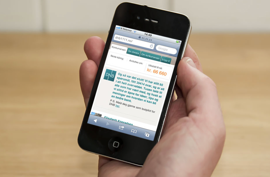Copywriting for Facebook-centered campaign. On November 11, 2011, Norways largest bank launched its new strategy and visual identity. Every 11 minutes, for 11 hours, a new question about DNB’s future service was posted, and for each one, a winner was selected to receive NOK 1111. During these few hours, more than 35 000 comments were received (enough to set off a few alarms in Menlo Park).